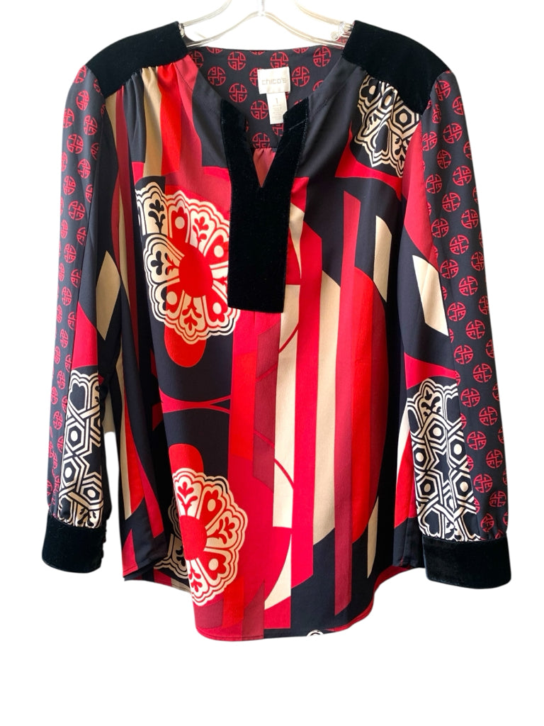 (1)-BLACK RED KHAKI PRINT VELOUR TRIMMED LS